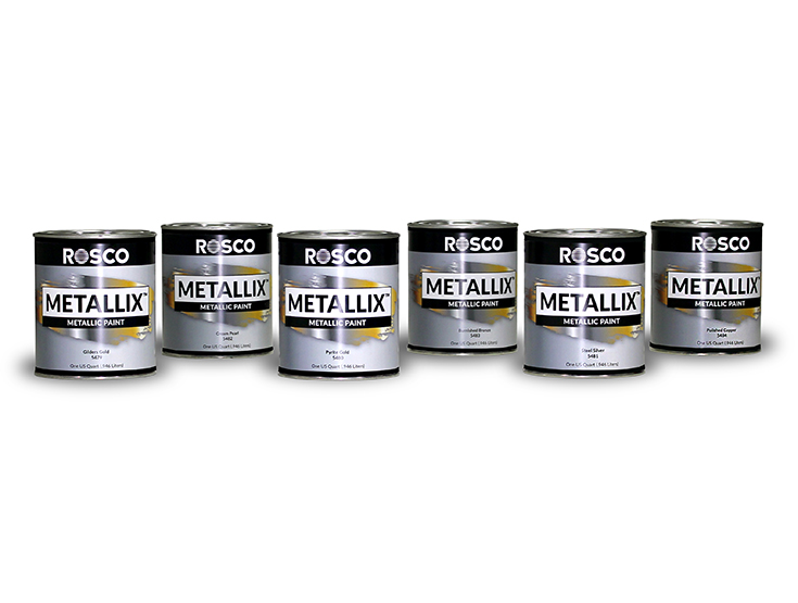 Rosco Metallix paints are water-based, acrylic paints that are formulated with mica powder to produce vibrant metallic finishes. Metallix paints can be applied via brush, roller or spray to any appropriately primed surface and dry to an even satin sheen. Available in quart and gallon sizes, Metallix can be tinted to a wide variety of colors using universal colorants. Perfect for scenic artists looking to enhance scenic elements, paint gilded set designs, and add metallic highlights on props.